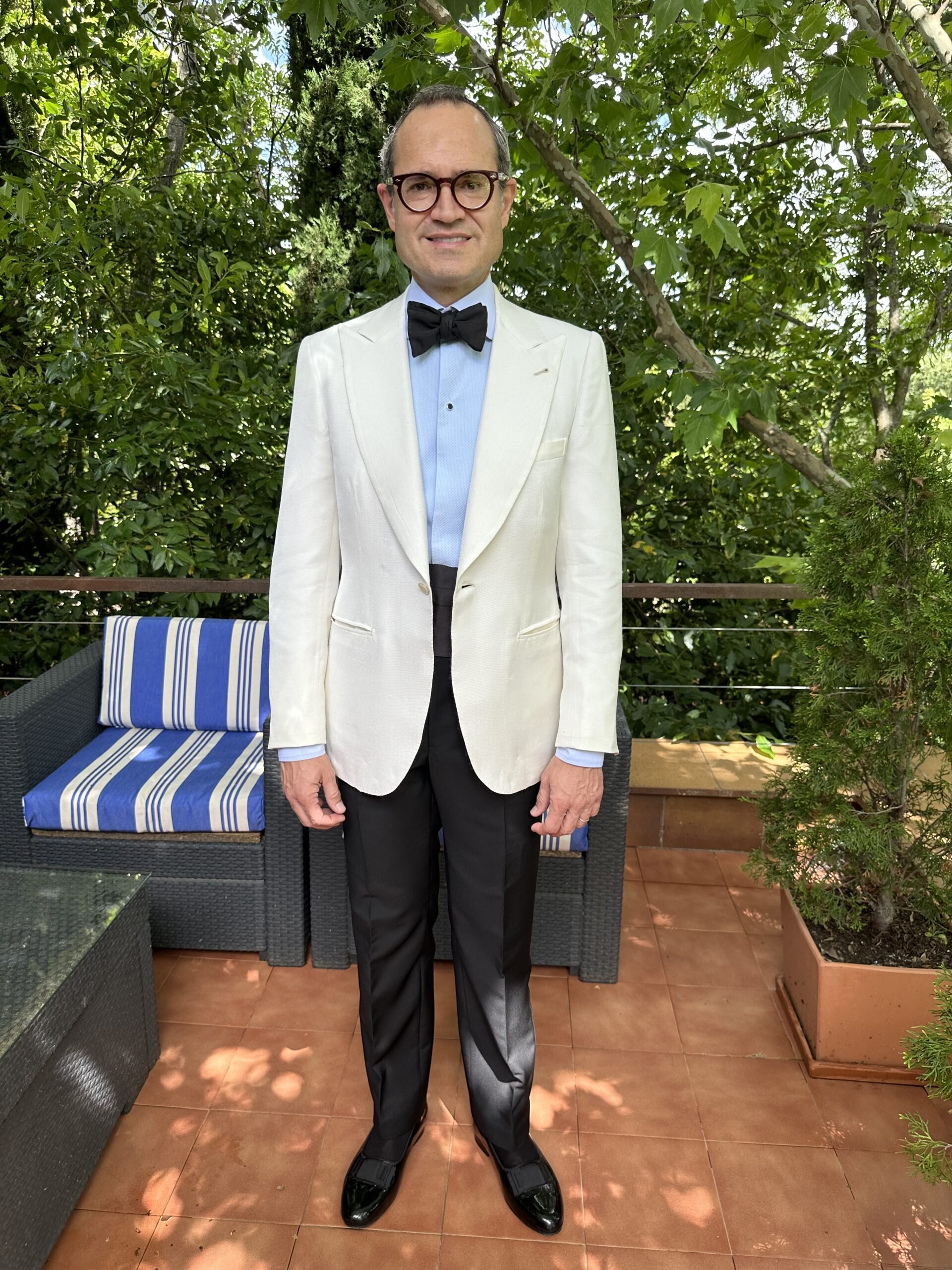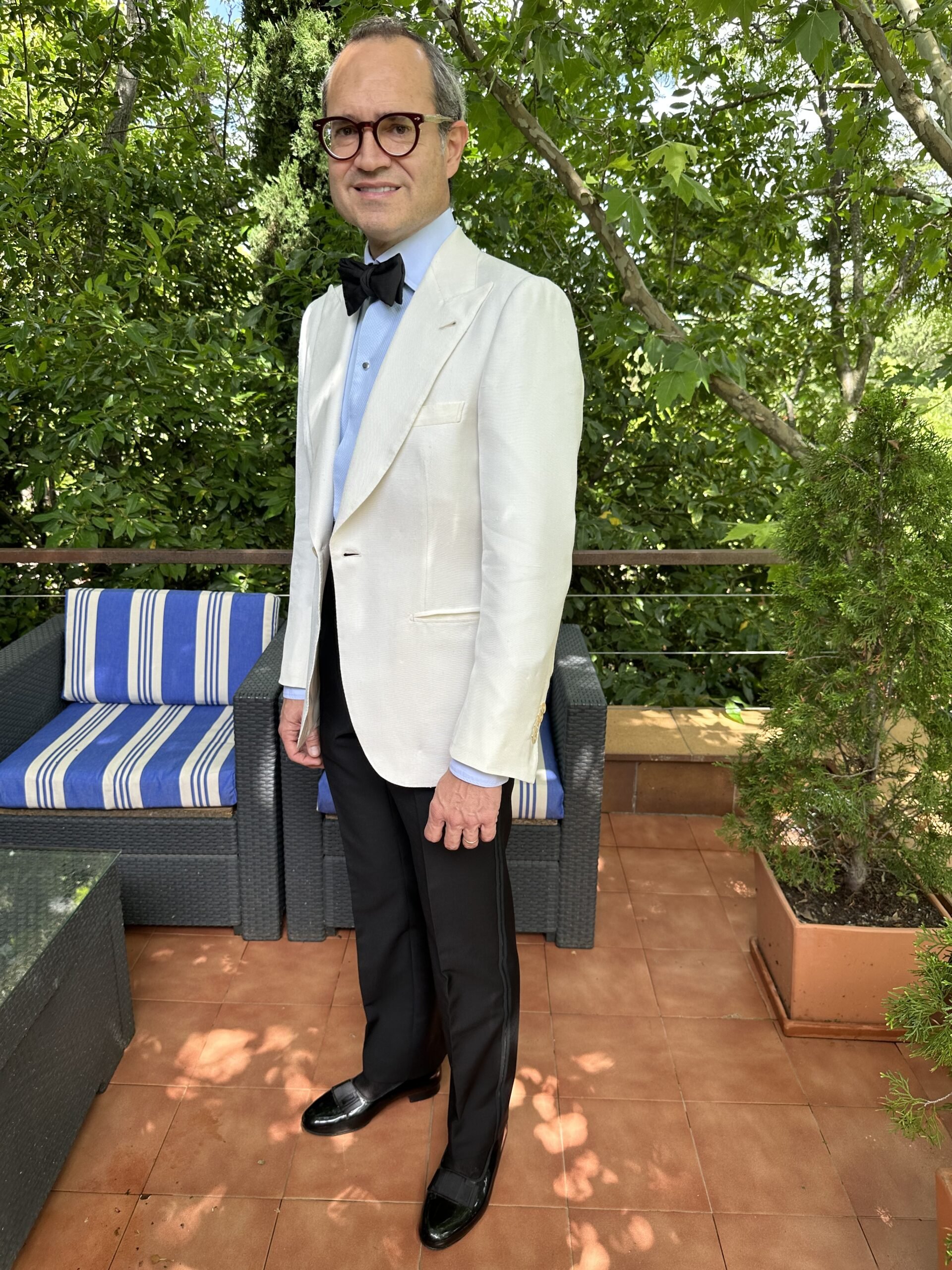 Me ha gustado mucho. Todo muy armonioso; algo nada fácil. La corbata de lazo de una pieza y a medida – perfecta en dimensiones, las opera pumps de Antonio Enrile que ya conocíamos pero que es hermoso recordar, esa camisa vintage de Mariano Langa, la botonadura, los calcetines que se aprecian de seda, el clavel nada estridente, el fajín..y ese esmoquin que no hace otra cosa que resaltar todo.
