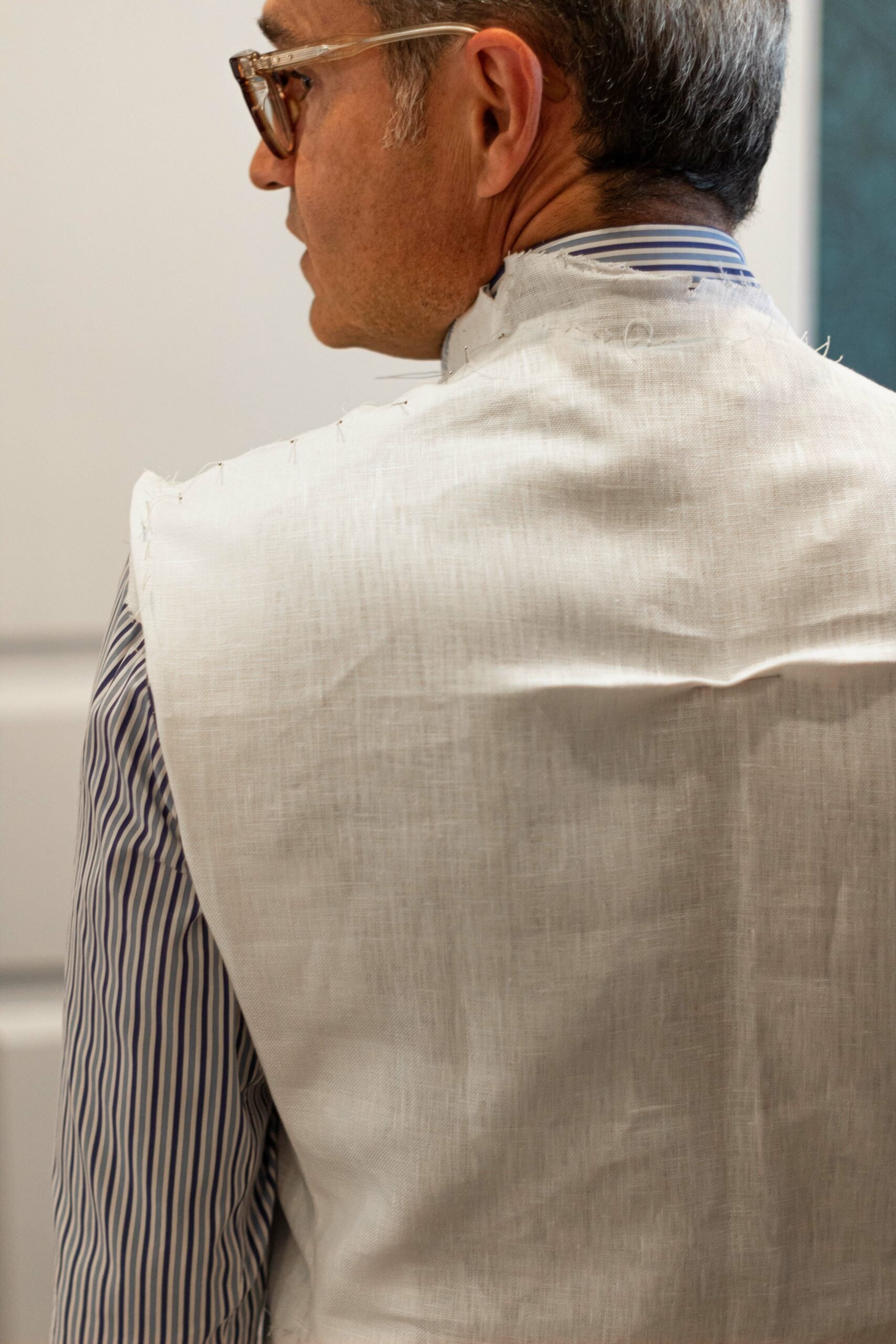 Si en el conjunto de César apostábamos por un pantalón de lino y una chaqueta con mezcla, en esta ocasión la chaqueta es 100% de lino y el pantalón con mezcla. También César nos confeccionó una preciosa chaqueta de esmoquin de seda blanca. Ya fuera por lo bien que quedó o por lo que destaca este tono blanco mate en verano, volvimos a escoger dicho color para esta chaqueta de calle a combinar con pantalón azul – de este último hablaremos en un próximo capítulo. En este caso la chaqueta sería de lino. De no optar por el traje completo de lino blanco, combinar una chaqueta de este color y tejido en un dos piezas no resulta particularmente sencillo y la línea entre lo elegante y llamativo puede ser muy fina.