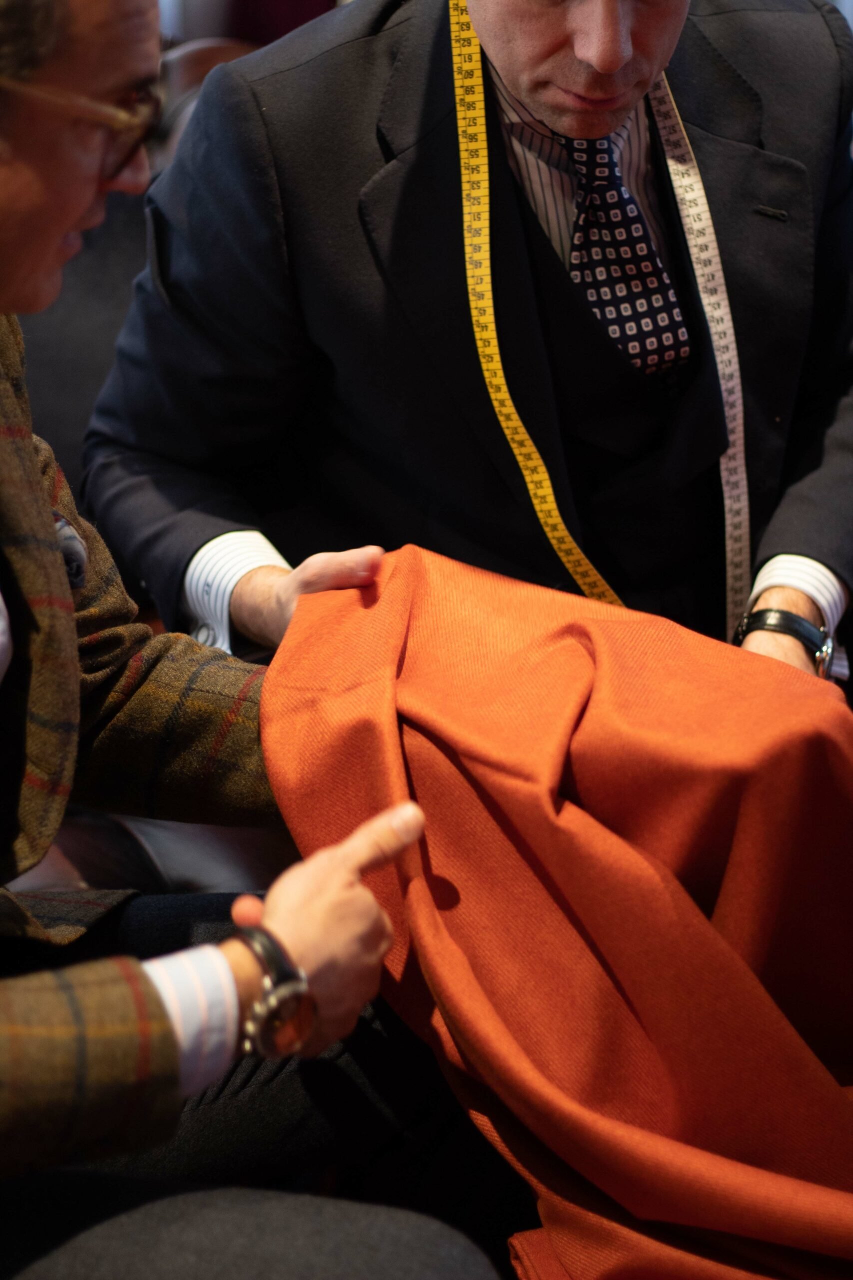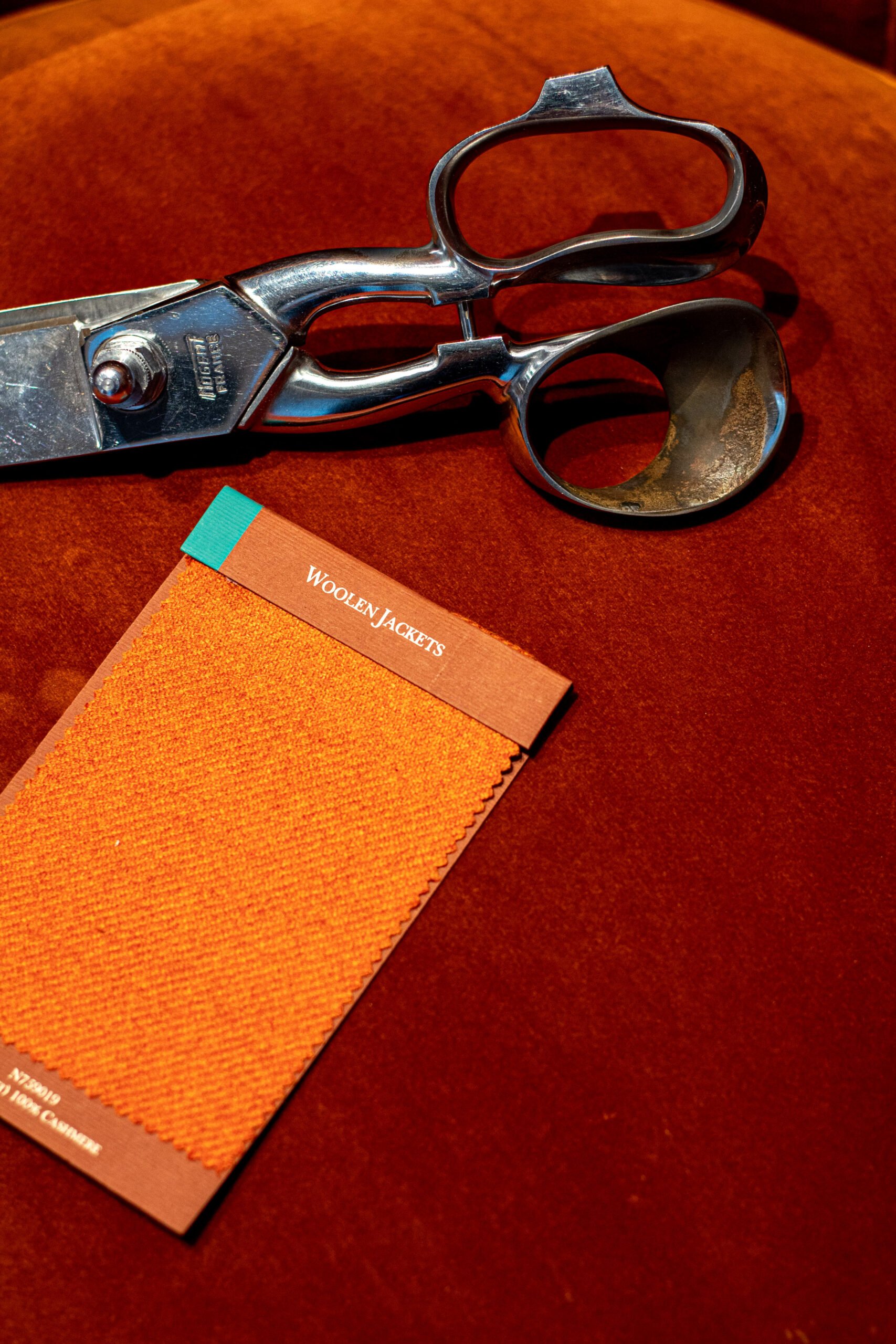 El tejido 100 % cachemira color calabaza, referencia N759019, perteneciente a la colección Cashmere – 759 de Loro Piana, presenta un gramaje de 300 g/ml, situándose en un rango óptimo para confección sartorial de alto nivel. Este peso confiere al tejido una estructura equilibrada y garantiza una caída natural sin comprometer su ligereza.