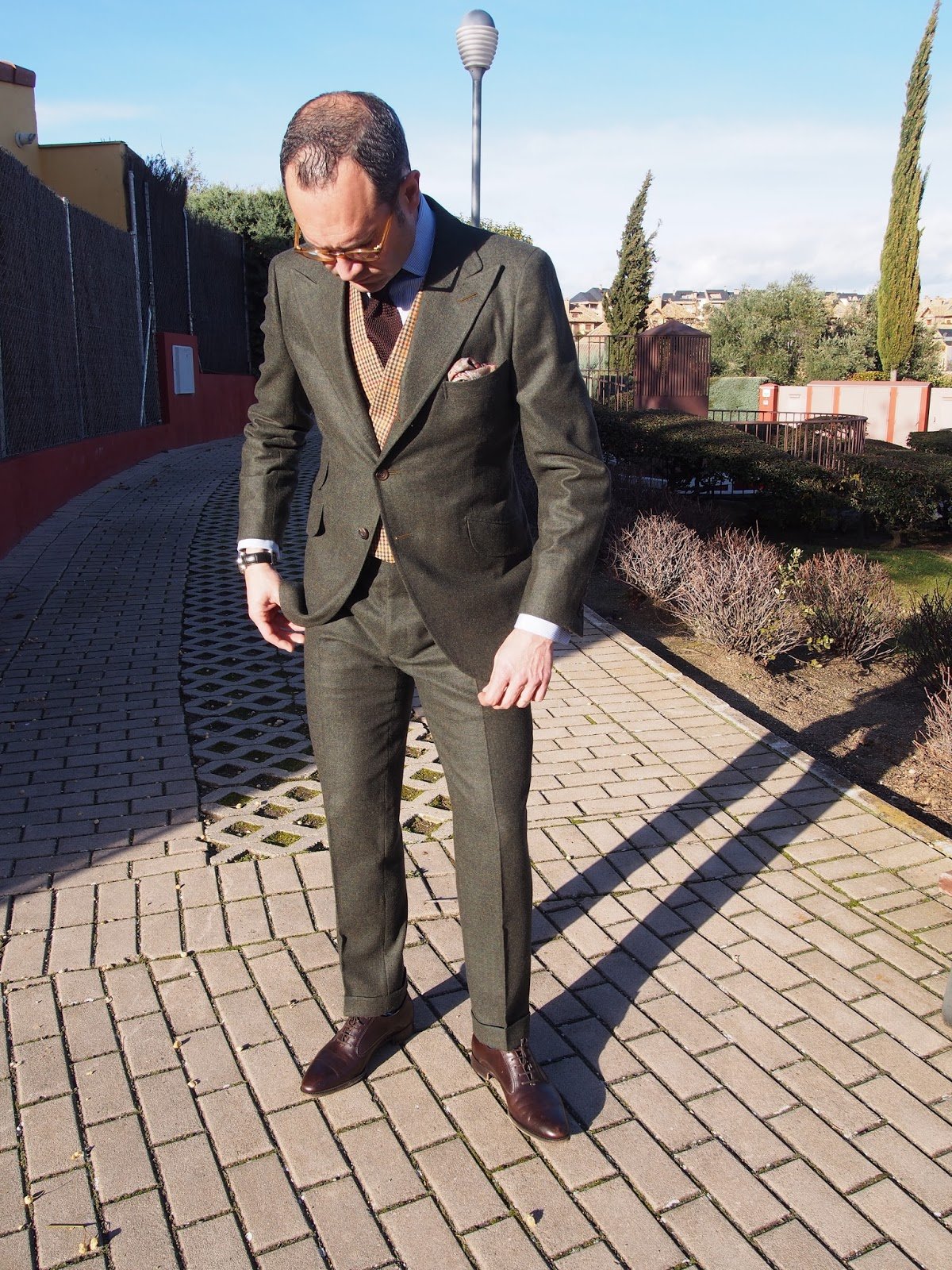 La chaqueta tiene el corte típico de D. José María. Un talle alto, algo que además de ser lo correcto es fundamental si se va a vestir el pantalón con tirantes. Una sisa también alta, igualmente fundamental para que no se desboque el cuello al sentarnos. La chaqueta abotonada marca de manera suave el talle y la cintura. Los hombros tienen las costuras cargadas algo que, si bien a mí me gusta, sobre todo en trajes de sport como este, no tiene porqué ser compartido por todos. Las solapas son algo más anchas de lo normal, aunque sin excesos, Esta vez las escogimos terminadas en punta, algo que no es más acertado que las chatas pero que elegimos porque nos parecieron más divertidas.