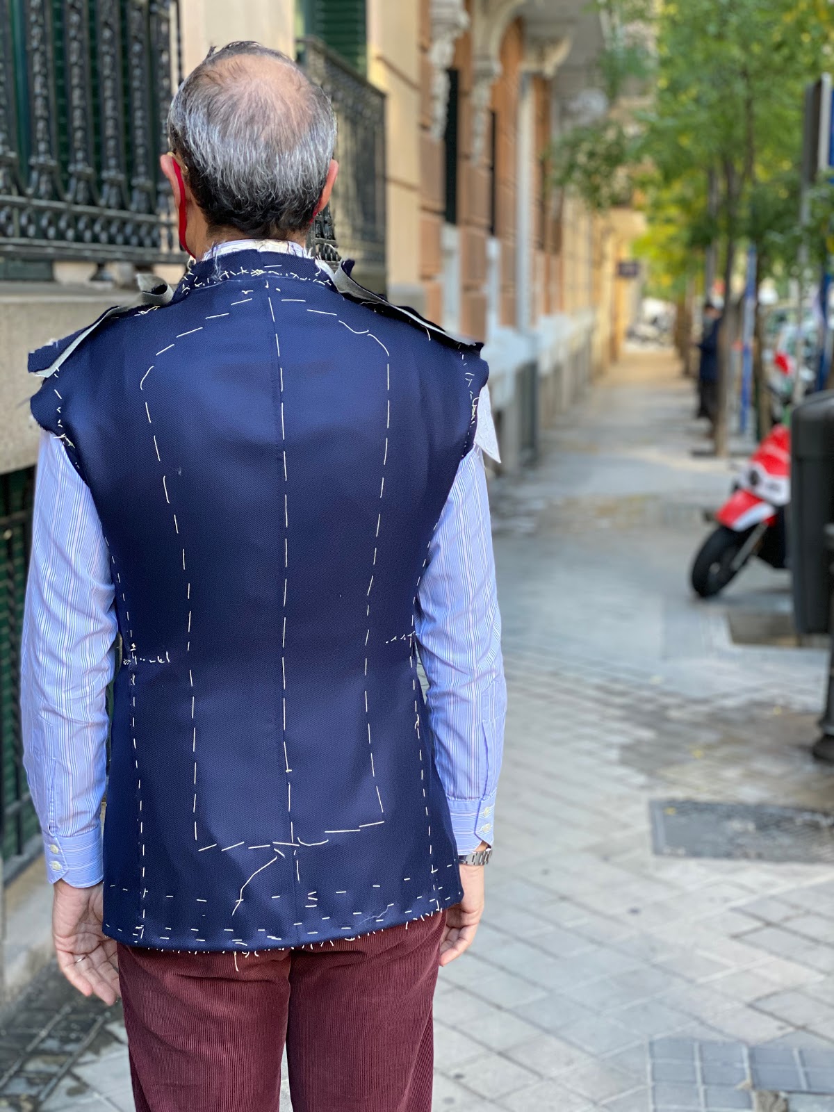 La artesanía, subiré fotos una vez concluida, se aprecia en la mano de obra. Aunque las solapas han sido cosidas a máquina – según D. José María la solapa le gira mejor que de picarlas a mano -, la gran mayoría – tampoco la tapeta del cuello – se ha hecho a mano. Y es precisamente en esta, y no tanto en otros detalles como botones, forros etc., donde radica la esencia del bespoke. La artesanía industrial, muy respetable pero siempre un escalón por debajo, puede conseguir una chaqueta de terminación aparentemente similar pero que no cumplirá con la demanda del paladar más exigente o entendido; paladar que seguirá demando que su chaqueta se cosa en un taller artesanal siempre por manos y no por máquinas. Y esta chaqueta, como muchas otras de nuestros escasos pero buenos sastres, nació en el taller de Monte Esquinza y no vio otras paredes que aquellas antes de abandonarlo.