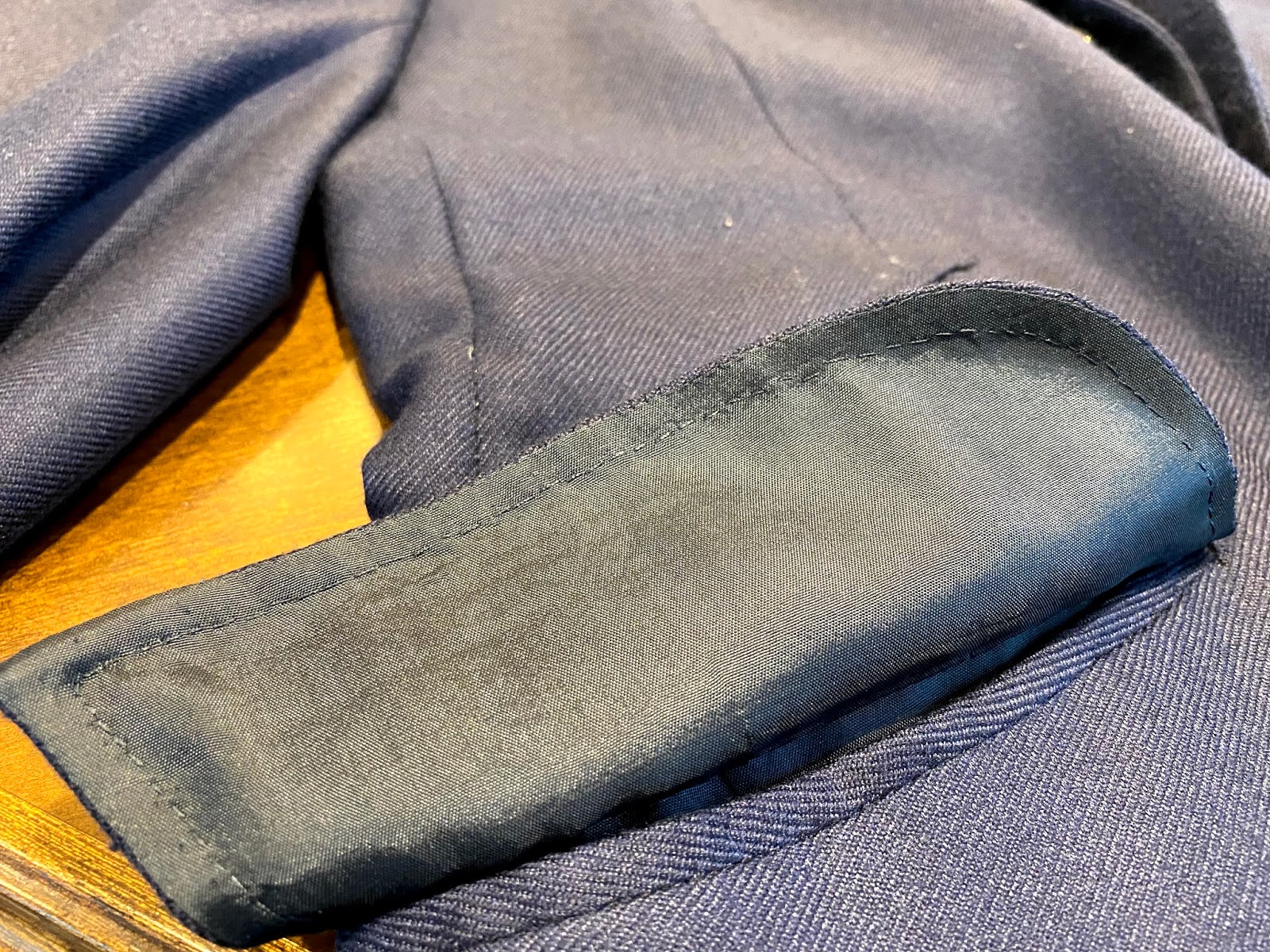 Si bien había otros forros que mirándolos independientemente eran más especiales, este era de los disponibles, desde mi opinión, el que mejor combinaba tanto con la chaqueta como con mis gustos y aficiones. Dicho esto, el forro nunca es tan importante pues al nunca verse es sobre todo para el disfrute del propietario. Como se observa en la foto, ha sido cosido a mano en forma de cruceta. Los costados de los bolsillos interiores cuentan con un refuerzo de costura que busca evitar de utilizarse para guardar la cartera que se terminen rajando. Este detalle, aunque también más estético que de utilidad, no es nada común en otras latitudes. (recuerdo hace cinco años mostrárselo a Lorenzo Cifonelli en una de mis chaquetas pues no lo había visto antes).