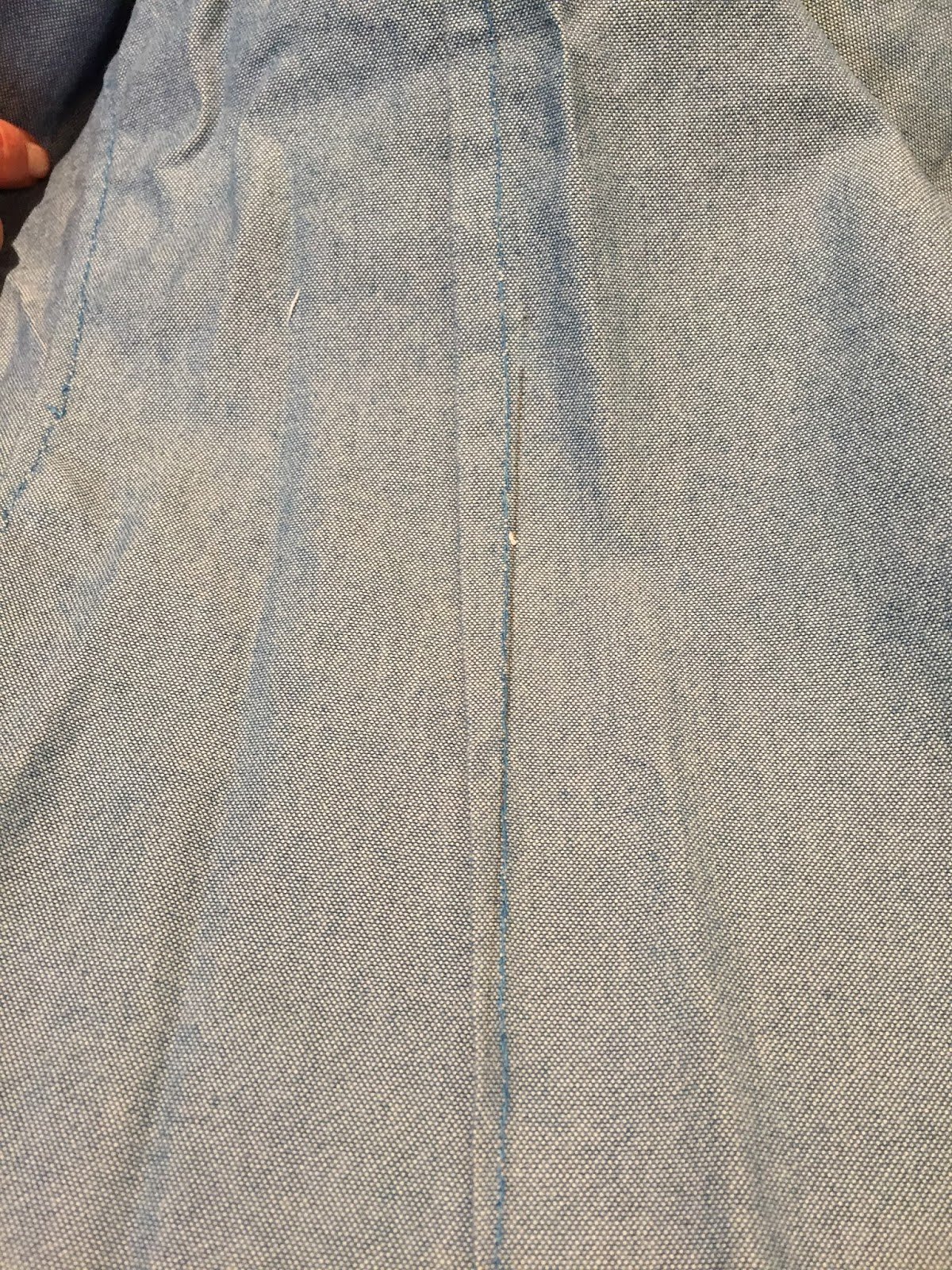 El reforzar esta parte de la camisa con una costura a máquina busca darle una resistencia extra a dicha parte. Esto también se puede apreciar en los costados de la camisa. Rara vez veremos dichos costados cosidos a mano y sin embargo en esta camisa se han cosido a mano y se han reforzado con una segunda costura a máquina.