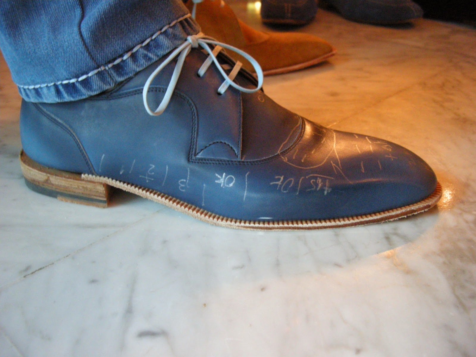 Con los zapatos puestos y de pie, Norman palpa todo el pie y va haciendo anotaciones sobre la piel de cada zapato. Mientras te hace preguntas sobre cómo lo sientes desde en la planta hasta en el comienzo de los dedos se van haciendo anotaciones para que no sobre piel pero sin que quede tan ajustado que al caminar pudiera llegar a molestar. En estos zapatos, si bien todavía no están cosidas las suelas (esto se hace luego en la segunda prueba) el cambrillón sí está formando parte de la suela ya que sin él, según nos cuenta Norman, sería muy difícil hacerse una idea exacta de cómo queda el zapato ya que al ponérselo se deformaría.