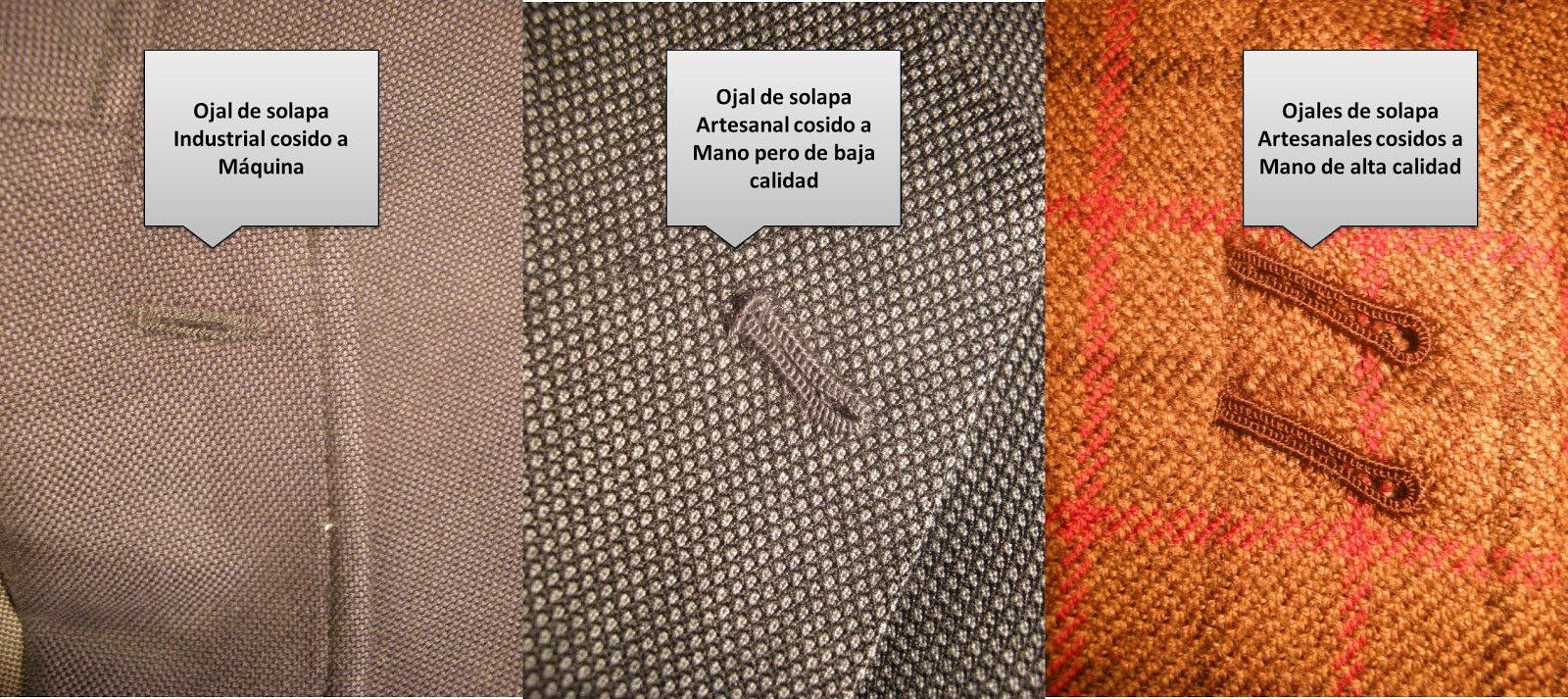 De conseguirlo y querer buscar argumentos de peso para pagar por ella lo que nos están pidiendo, fijémonos en que el hilo cubra toda la extensión del ojal y no se aprecie espacios entre puntada y puntada. No solo es importante el que haya sido cosido algo a mano sino también que se haya realizado con pericia.