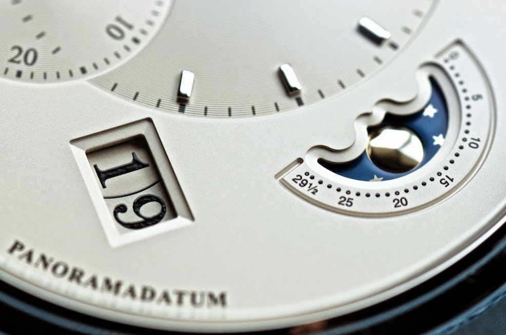 No quiero aburriros con los más de 165 años de historia de esta casa alemana ni de la importancia de la ciudad de Glashütte en la historia de la relojería mundial ya que a quienes le interese con seguridad ya la conocerán y a los que no solo conseguiría aburrirles. Por lo que me centraré en este reloj en cuestión. El PanomaticLunar cuenta con el calibre 100% manufactura 90-02 –pero manufactura de verdad y no solo porque lo diga el catálogo de la casa- y además de la hora y los segundos, cuenta con una fase lunar y con un “Panomaratum”; una gran fecha a dos niveles.